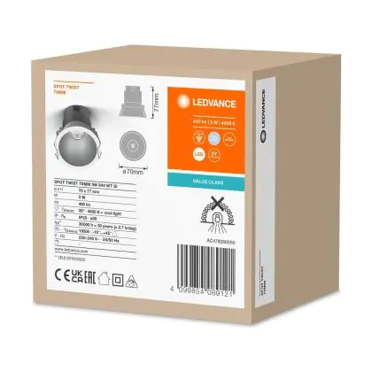 Descrizione Ledvance Faretti LED Twist Pro Aluminium Argento Riflettore 5W 400lm 30D - 840 Bianco Freddo | 70mm - Ritaglio 65mm - IP20