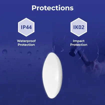 Un elemento importante delle plafoniere e delle applique LED è il loro livello di proezione IP, che indica la protezione contro l'ingresso di polvere e umidità/acqua. A partire da IP65, un apparecchio di illuminazione è a prova di polvere e acqua. Il valore IP di questa plafoniera LED è: IP44. Stai cercando una plafoniera LED per esterni? Allora presta attenzione alla protezione da urti e impatti, ovvero il valore IK, che per questa lampada è IK02 - 0.20 Joule.