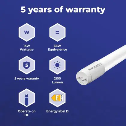 Il Noxion Tubo LED T8 Avant Extreme (HF) High Output 14W 2100lm - 865 Luce del Giorno | 120cm - Sostitutiva 36W è l’alternativa perfetta per il tubo fluorescente standard 36W nelle plafoniere con un reattore. Con questo tubo LED hai una garanzia di una vita media utile molto lunga e 5 anni Lampadadiretta.it di totale garanzia. .
