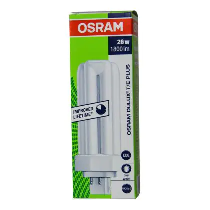 Le Osram DULUX T/E 26W/840 PLUS Lumilux Cool White sono efficienti lampade fluorescenti compatte dotate di attacco a 4 pin (perni). La potenza delle stesse é pari a 26W. Queste lampade emettono una luce di buona qualità e presentano un'ottima efficienza luminosa.