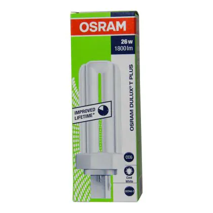 Le Osram Dulux T 26W/840 PLUS Lumilux Cool White sono lampade a basso consumo caratterizzate da una vita media lunga e che emettono una luce di buona qualità. La base di queste lampade fluorescenti compatte é del tipo a 2 pin (perni). La potenza delle medesime é pari a 26W.
