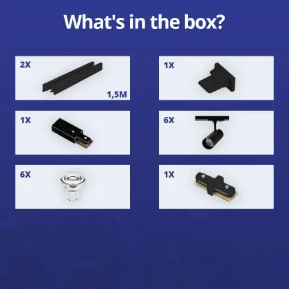 Descrizione Set completo 1-Fase Rail 3 Metro Nero | incl. 6x Faretti + GU10 2700K 3W Dimmerabile + Tappo Di Chiusura, Connettore di Alimentazione e I-Connettore